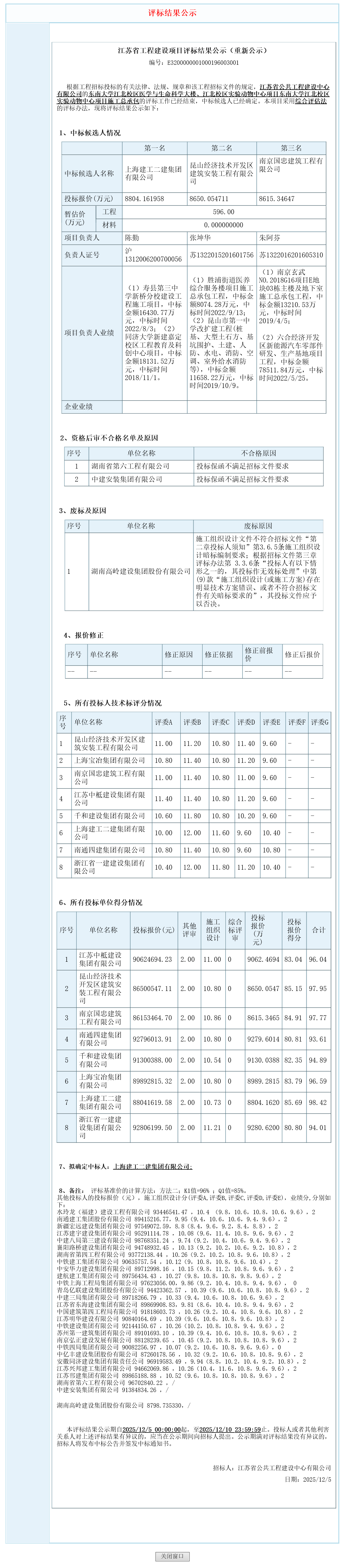 评标结果公示 | 东南大学江北校区实验动物中心项目施工总承包(重新公示)
